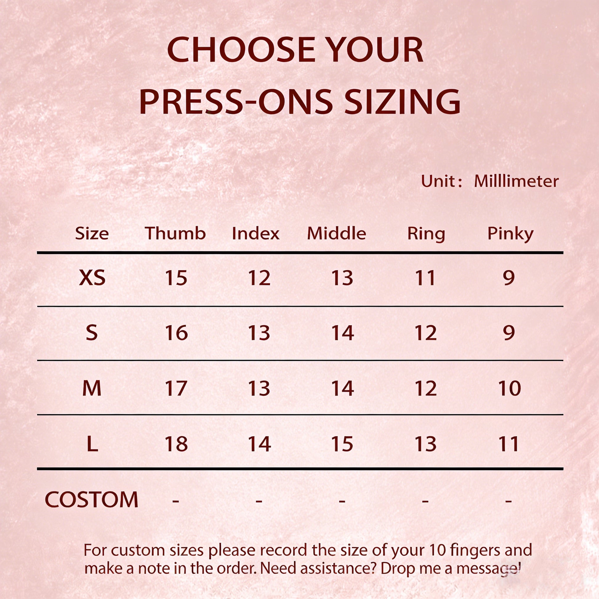 For custom sizes, please specify your custom sizes (from thumb to pinky) when placing your order.✍🏻