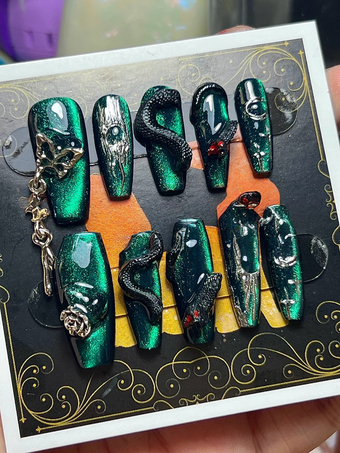 HexClaw | emerald green nails,snake skin nails,dragon nails,press on claw nails,nails press on,armor,claw,acrylic nails,werewolf nails